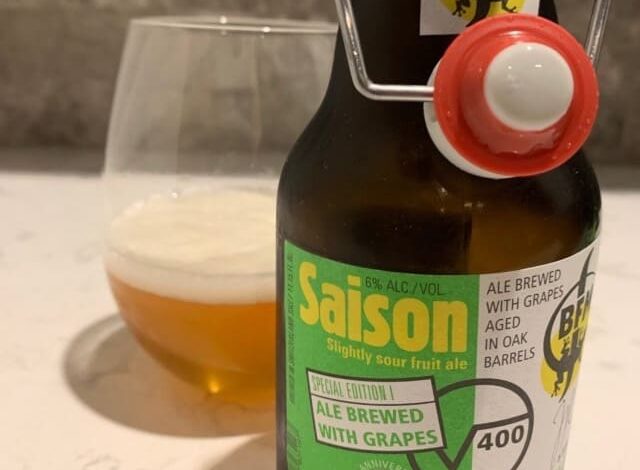 Dal praticamente sconfinato repertorio delle etichette firmate in Svizzera (siamo a Saignelégier, Canton Giura) dalla BFM – Brasserie des Franches-Montagnes selezioniamo la √400 di base una Saison (appunto) messa a dimora in botte e qui portata a maturazione mediante contatto con vinacce (marc), per l’esattezza provenienti da un mosto di Syrah e Merlot.