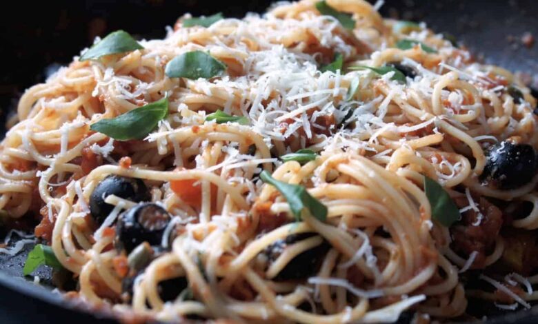 Veloce, gustoso, mediterraneo e fresco abbastanza da poter affermare che si addice ottimamente anche alle settimane di quell’appendice d’estate che è il mese di settembre, il primo piatto di cui trattiamo nell’occasione è davvero un piccolo compendio di cucina tricolore. Lo si prepara con pomodori (sbollentandoli, pelandoli e tritandoli), peperoni gialli e verdi (da pulire, separare dai semi e tritare a cubetti), olive preventivamente snocciolate; del buon Extravergine (da scaldare in padella, per poi unirvi gli ortaggi sopra menzionati, insieme a spolverate giudiziose di sale e pepe); ovviamente gli spaghetti (da cuocere in acqua e quindi saltare nella padella appena citata); infine, una grattugiata di Pecorino Romano, con cui guarnire il tutto.