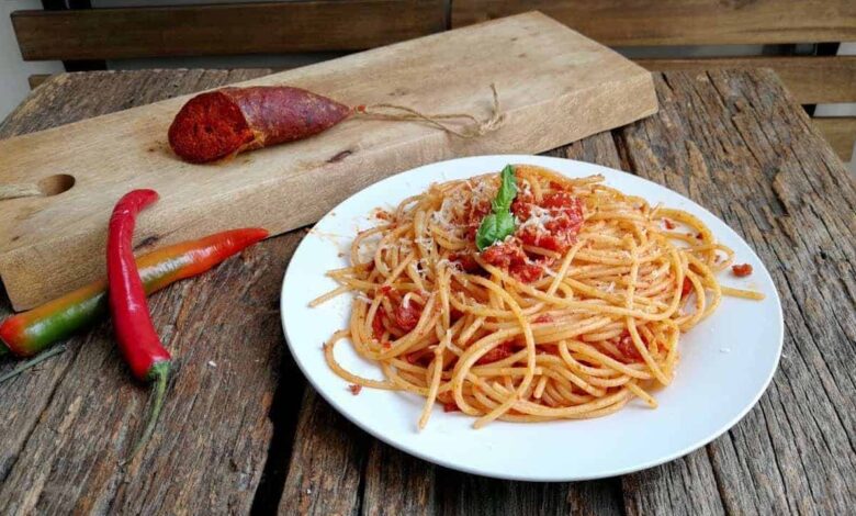 In questo caso, puntiamo su una portata fumante di classici spaghetti: per mettere a tavola quattro persone, ne occorreranno 3 etti abbondanti; oltre a 80 grammi di n’duja stessa, una cipolla di Tropea, 3 etti e mezzo di polpa di pomodoro, una fiaschetta d’olio extravergine d’oliva, una saliera, qualche foglia di basilico. E fatta la spesa, si faccia da mangiare! Prima manovra: tritare la cipolla, adagiarla in una padella con olio e lasciarla delicatamente appassire. Quindi, mano all’insaccato: rimuoverne il budello, ridurne la carne in ciccioli e sistemarli nella stessa padella (sempre sul fuoco), irrorando il tutto con un mezzo bicchiere d’acqua calda e mescolando. Ora tocca alla polpa di pomodoro: da aggiungere a sua volta al sugo in costruzione, per poi amalgamarlo ben bene a colpi di mestolo, lasciandolo sulla fiamma ancora 15 minuti. Dopo aver fatto cuocere gli spaghetti, scolarli al dente e riversarli, anch’essi, in padella; rifinire con scaglie di basilico; far saltare per due minuti e, a quel quel punto, dare libero sfogo alla propria gola.