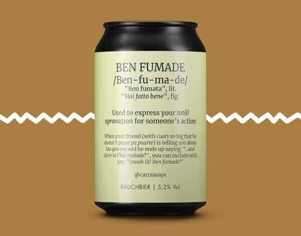 Dalle officine friulane Bondai (a Sutrio, in provincia di Udine), una Rauchbier diligente e gradevole: niente grilli per la testa, niente fronzoli, solo attinenza stilistica e facilità di bevuta (se pare poco). D’altra parte il suo nome, Ben fumade, nel dialetto locale significa letteralmente Ben fumata; e su un piano traslato Ben fatto. Un battesimo, un programma, insomma.