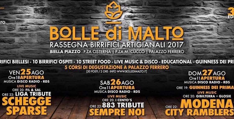 14 birrifici coinvolti, tra cui 4 biellesi, 10 street food, 5 corsi di degustazione: questi i numeri di una rassegna che da giovedì 24 a domenica 27 agosto a Biella animerà il borgo storico del Piazzo. La terza edizione scalderà i motori giovedì 24 agosto, alle 21, con la cena di gala “Aspettando Bolle di Malto” sotto le stelle al chiostro di Palazzo Ferrero: 6 degustazioni di birra e relative portate accompagnate dalle melodie del Jazz Club Biella (prenotazione obbligatoria). Venerdì 25 agosto alle 18 iniziano le “danze” con stand di degustazione, corsi, street food e musica live. Per chi arrivasse in macchina sarà possibile sostare nei parcheggi limitrofi usufruendo delle navette gratuite. Per informazioni: bolledimalto.it