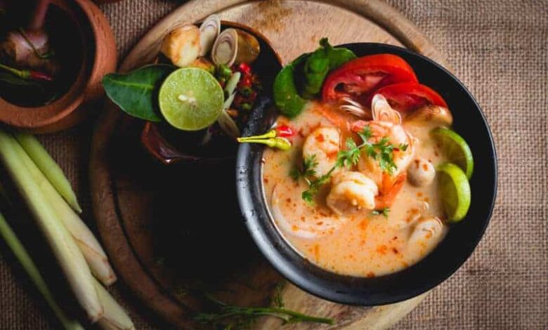 Ma la reinterpretazione creativa è lampante, così come il sapiente utilizzo di erbe aromatiche, frutti e spezie come il lemongrass, foglie di Kaffir lime, tamarindo, numerose varietà di basilico e di peperoncini, zenzero e il suo più nobile fratello thailandese, il Galangal. L’umami poi non si accontenta di essere rappresentato dalla salsa di soia ma trova man forte nella popolare fish sauce o nella oyster sauce, che regalano ad ogni piatto una marcia gustativa in più. Il tipico piatto thailandese è capace di abbinare sapori, consistenze, colori ad una decorazione curata e dettagliata. Se a tavola il piatto è condiviso e viene messo al centro per far sì che tutti i commensali prendano la loro parte, ben differente è lo spirito frenetico – ancorché affascinante – che anima il consumo dei cibi di strada. Nominata capitale incontrastata dello street food, Bangkok propone bancarelle e chioschi in ogni dove, oltre che nei vivaci mercati. Le strade congestionate dal traffico diventano il palcoscenico di una proposta culinaria illimitata per qualità e quantità, dalla cottura alla brace di ogni tipo di carne e pesce, piatti di riso saltato o noodles in enormi wok, ma anche cotture al vapore, fritture di ogni sorta, dolci e frutta deliziosa. Pensando ad un piatto rappresentativo della cucina thai che racchiuda il tripudio armonioso dei cinque sapori fondamentali, abbiamo pensato al celebre Tom Yum una zuppa tipica la cui versione più popolare e diffusa prevede l’utilizzo dei gamberi (Tom Yum Goong o Kung).