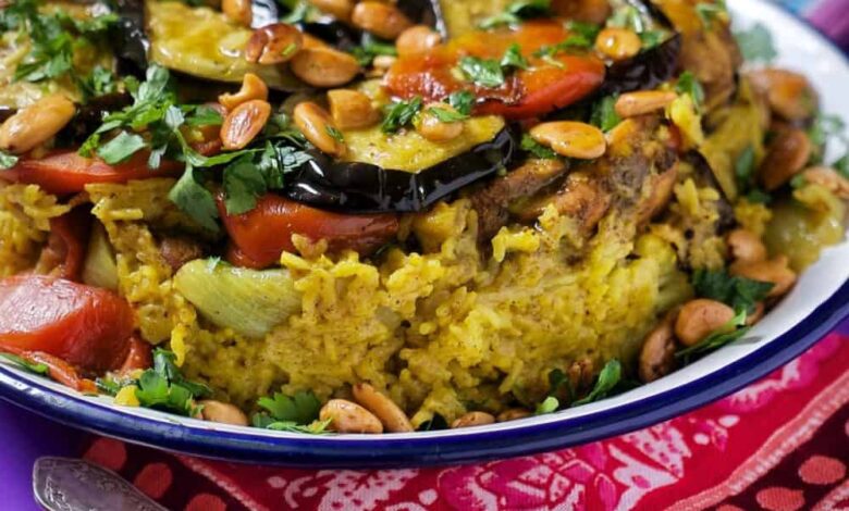 Raccogliamo gli ingredienti necessari (le dosi sono per un pranzo generoso): 1 kg di riso ribe (meglio se si riesce a trovare il riso egiziano) , 3 polli tagliati a pezzi, 3 melanzane, 1 cavolfiore, 3 pomodori, 3 cipolle, 3 limoni, 1 aglio, olio di semi, olio d’oliva, misto di spezie in polvere per maqlouba (curcuma, pepe, alloro, noce moscata, cannella, cumino, zafferano, peperoncino, origano, cardamomo, chiodi di garofano, paprika, e pepe), sale. Per la preparazione: puliamo bene i pezzi di pollo strofinandoci sopra del sale e sciacquamoli poi sotto acqua corrente. Trasferiamo i pezzi di pollo in una ciotola capiente, passiamoci sopra gli spicchi di limone, saliamo e aggiungiamo l’olio d’oliva e il misto di spezie, rigiriamo energicamente e lasciamo il pollo a marinare per un paio di ore. Il pollo andrà poi arrostito nel forno in una teglia cosparsa di olio. Mettiamo il riso in ammollo per mezz’ora in una zuppiera e poi sciacquiamo più volte per fargli perdere l’amido. Tagliamo il cavolfiore a tocchetti e le cipolle a spicchi. Le melanzane andranno tagliate a fette, disposte su di una teglia, cosparse di sale e lasciate a spurgare l’acqua per un’ora. Versiamo quindi abbondante olio di semi in una grande padella (meglio se di ferro) e, quando bolle, cominciamo a friggere le verdure e lasciamole poi ad asciugare su di una teglia coperta di carta assorbente e saliamole. Mettiamo sul fuoco una capiente casseruola, sul fondo disponiamo qualche spicchio d’aglio e di pomodoro, poi le melanzane e sopra i pezzi di pollo arrosto e poi le cipolle e il cavolo e infine il riso, sciacquato e scolato. Ricopramo il tutto con il sugo di cottura del pollo e dell’acqua giusta di sale (o meglio del brodo di pollo). Il liquido dovrà coprire completamente il riso di un paio di centimetri, verificatelo dopo aver pressato leggermente il riso verso il basso della pentola con le mani. Facciamo prendere il bollore alla pentola tenendo il gas alto per i primi 5 minuti e poi abbassiamolo lasciando cuocere lentamente la Maqlouba per circa 30 minuti (il tempo di cottura dipende dal tipo di riso utilizzato). Teniamo sempre il coperchio chiuso e non mescoliamo mai il riso (si devono mantenere intatti gli strati fatti). Se necessario aggiungiamo del brodo durante la cottura, ma attenzione a non esagerare perché per rigirare la maqlouba il liquido della pentola dovrà essere completamente assorbito ed il riso asciutto. Una volta tolta la Maqlouba dal fuoco lasciamola riposare per cinque minuti, poi togliamo il coperchio ed al suo posto mettiamo un grande piatto o vassoio rotondo da portata, raduniamo gli ospiti intorno al tavolo e procediamo con la rigirata (ricordarsi di mettere un canovaccio spesso sul fondo della pentola per non bruciarsi). Attendiamo qualche istante prima di sollevare, molto lentamente, la pentola e guarniamo la maqlouba con prezzemolo tritato e mandorle tostate.