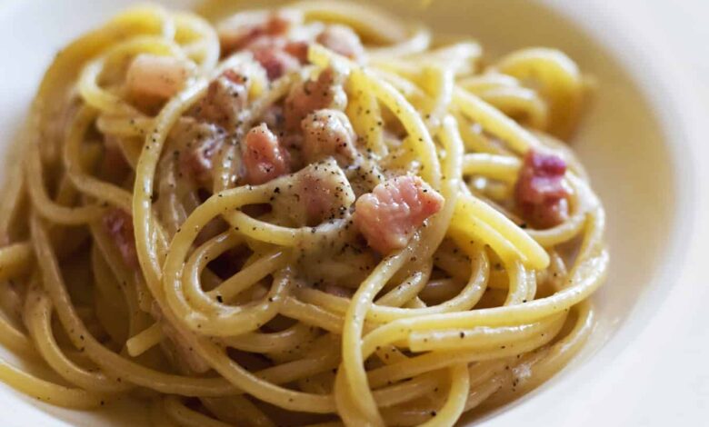 La preparazione prevede di tagliare il guanciale in fette alte un centimetro, separarne la carne dalla cotenna, ridurle a loro volta in strisce di mezzo centimetro, sistemandole in una padella precedentemente riscaldata per sfriggerle a fuoco medio fino a renderle dorate e croccanti (dieci di minuti la tempistica di riferimento). Nel frattempo grattugiare il Pecorino, portare a ebollizione una pentola d’acqua e (aggiunto il sale) farvi cuocere la pasta, versando un cucchiaio della stessa acqua in cottura sulle listarelle di guanciale, quando a fuoco lento il grasso si sarà in parte disciolto e il magro leggermente abbrustolito. Formatasi nella padella (tra grassi del maiale e amidi della pasta) una crema appetitosa, dare una smossa al tutto, scolare la pasta e unirla al condimento, insaporire ulteriormente con 30 grammi di formaggio. Impiattare, servire in tavola e riservare il Pecorino rimanente per le ulteriori guarniture personali.