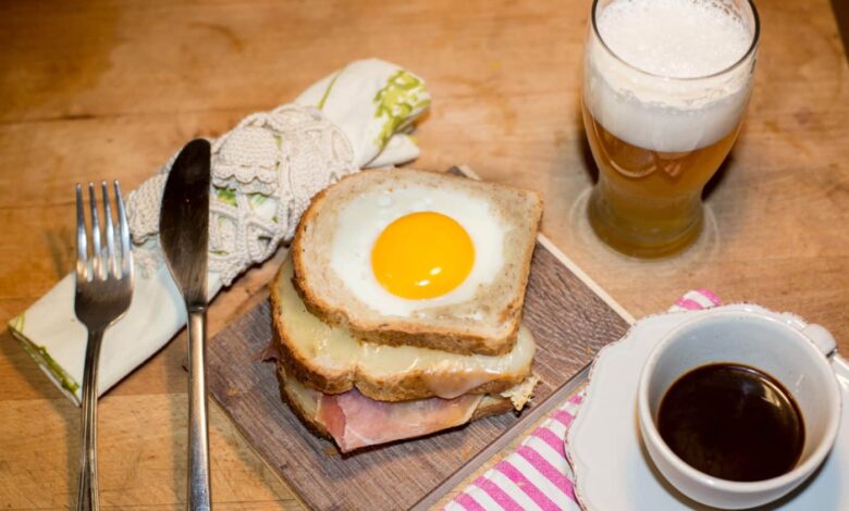 Ricco e goloso il croque monsieur è giocato sulla dolcezza degli elementi che lo compongono e sul bilanciamento della sensazione grassa. Il pane tostato aiuta ad assorbire i grassi della caciotta e della mortadella pur non contrastandoli del tutto. Ne risulta una sensazione molto piacevole di croccantezza, cereale e grasso animale goloso e non soffocante. In abbinamento optate per una birra con un buon tenore alcolico e una buona gasatura in modo tale da assicurare pulizia e rinnovare il piacere dell’assaggio. Scegliete una birra dalle note fresche floreali e fruttate che aiutano ad alleggerire il piatto e ne completano degnamente il profilo aromatico, come una blond ale, ad esempio come la belga Rulles Blonde de La Rulles o l’italiana Tuvì Tuvì del birrificio sardo Barley (Maracalagonis, Cagliari). Nel croque madame, il crudo e il caprino formano tra loro un ottimo mix tra sapidità e grassezza, sensazioni in parte attutite dal pane tostato. A tutto questo si aggiungono le note peculiari dell’uovo volutamente lasciato molle e quindi capace di “colare” dall’alto su ogni boccone, che contribuiscono ad arricchire il morso in quella che diventa una lunga marcia trionfale del gusto. Come abbinamento è necessario trovare qualcosa capace di arginare il piatto come una saison di carattere che con la sua pimpante gasatura, le note fresche e una buona secchezza riuscirà a frenare la corsa del piatto lasciando la bocca pulita e dispensando gradevoli aromi speziati. Suggerimenti? Provate con l’italiana New Morning del Birrificio del Ducato o con la Vermontoise del la brasserie belga Blaugies.