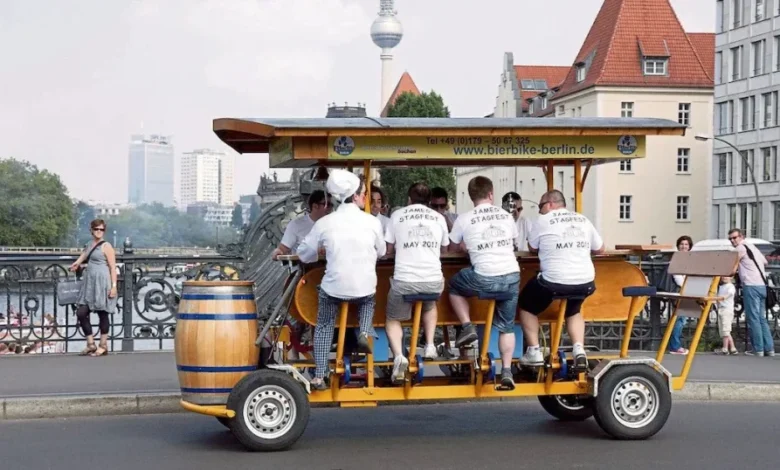 Andare in giro per la città in compagnia, sorseggiando birra a go go, ascoltando musica, bruciando anche qualche caloria e senza rischiare nessuna decurtazione di punti dalla propria patente. È questa l’idea degli organizzatori a Berlino della bierbike, un modo “nuovo” di bere, un modo alternativo di viaggiare per turismo in città. Una vera e proprio multi-bike, 16 posti a sedere, dieci dei quali muniti di pedali, un guidatore del mezzo (fornito dal noleggiatore), un bancone di legno interno sul quale appoggiare i boccali di birra (forniti anch’essi dal noleggiatore), una spina per spillare la birra dal barile posto rigorosamente a prua del mezzo, un lettore CD per ascoltare la musica, un tettuccio per riparare (poco, a occhio) dalla pioggia, evento non certo infrequente da quelle parti.