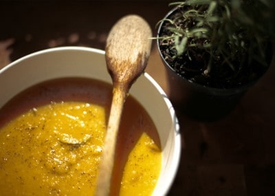 Cuocere a fuoco basso e con coperchio per 20 minuti circa (fino a che le patate non si ammorbidiscono) aggiungendo il brodo fino a consumarne circa la metà. Passare tutto in un passaverdure o frullare con il mixer. Continuare a fare sobbollire la vellutata aggiungendo il restante brodo fino a raggiungere la consistenza desiderata. Trasferire le porzioni in terrine, pepare e salare secondo gusto, aggiungere un filo di olio crudo e un rametto di rosmarino.