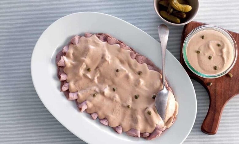 Procuriamoci 1kg di girello di vitello (o Magatello o Lacerto che dir si voglia), 1 carota, 1 cipolla piccola, 2 chiodi di garofano, qualche grano di pepe, 2 foglie di alloro, 2 foglie di salvia, 1 rametto di rosmarino, 1 bottiglia da 33 cl di birra in stile Gose; per il brodo vegetale: 1 carota, un gambo di sedano, 1 cipolla. Per la salsa tonnata con la maionese: 2 tuorli, 200 ml di olio extravergine di oliva, poco meno di mezzo limone, 1 cucchiaino di senape, sale q.b, 200 g di tonno sott’olio sgocciolato, un cucchiaio di capperi dissalati, 6 filetti di acciughe sott’olio, un cucchiaino di aceto di mele (se piace). Iniziamo preparando il brodo vegetale con circa 1l di acqua al quale aggiungeremo le verdure indicate e sale q.b. per circa mezz’ora e lasciamolo raffreddare completamente. In una casseruola disponiamo, senza accendere il fuoco, la carne con carote e cipolle tagliate grossolanamente, le spezie, alloro e rosmarino e salvia, un filo di olio EVO. A questo punto aggiungiamo la Gose e mestolate di brodo vegetale fino a coprire per più di metà il girello. Copriamo la casseruola con un coperchio e accendiamo il fuoco medio-basso per i primi 10/15 minuti e successivamente molto basso, per circa un’ora (l’ideale sarebbe misurare il centro con una sonda-termometro e raggiungere i 54°C). Togliere il girello dal suo brodo (che va conservato e lasciato raffreddare) e coprirlo con un foglio di alluminio. Nel frattempo prepariamo la salsa tonnata iniziando dalla maionese, utilizzando una planetaria o alla vecchia maniera, sbattendo i due tuorli con poco meno di mezzo limone ed il cucchiaino di senape ed aggiungendo lentamente l’olio a filo. Nel recipiente del mixer mettiamo quindi la maionese preparata, il tonno sgocciolato, i capperi ben dissalati e strizzati, le acciughe e se necessario, un po’ del brodo di vitello e frulliamo. Mettiamo la nostra salsa in frigo (possiamo preparare la salsa tonnata anche mettendo due uova sode al posto della maionese e aggiungendo più brodo mentre frulliamo). Tagliamo a fette sottili il girello e disponiamole su un piatto da portata, lasciandole adagiare anche in modo un po’ disordinato, alternando ciuffi di salsa tonnata e guarnendo con capperi.
